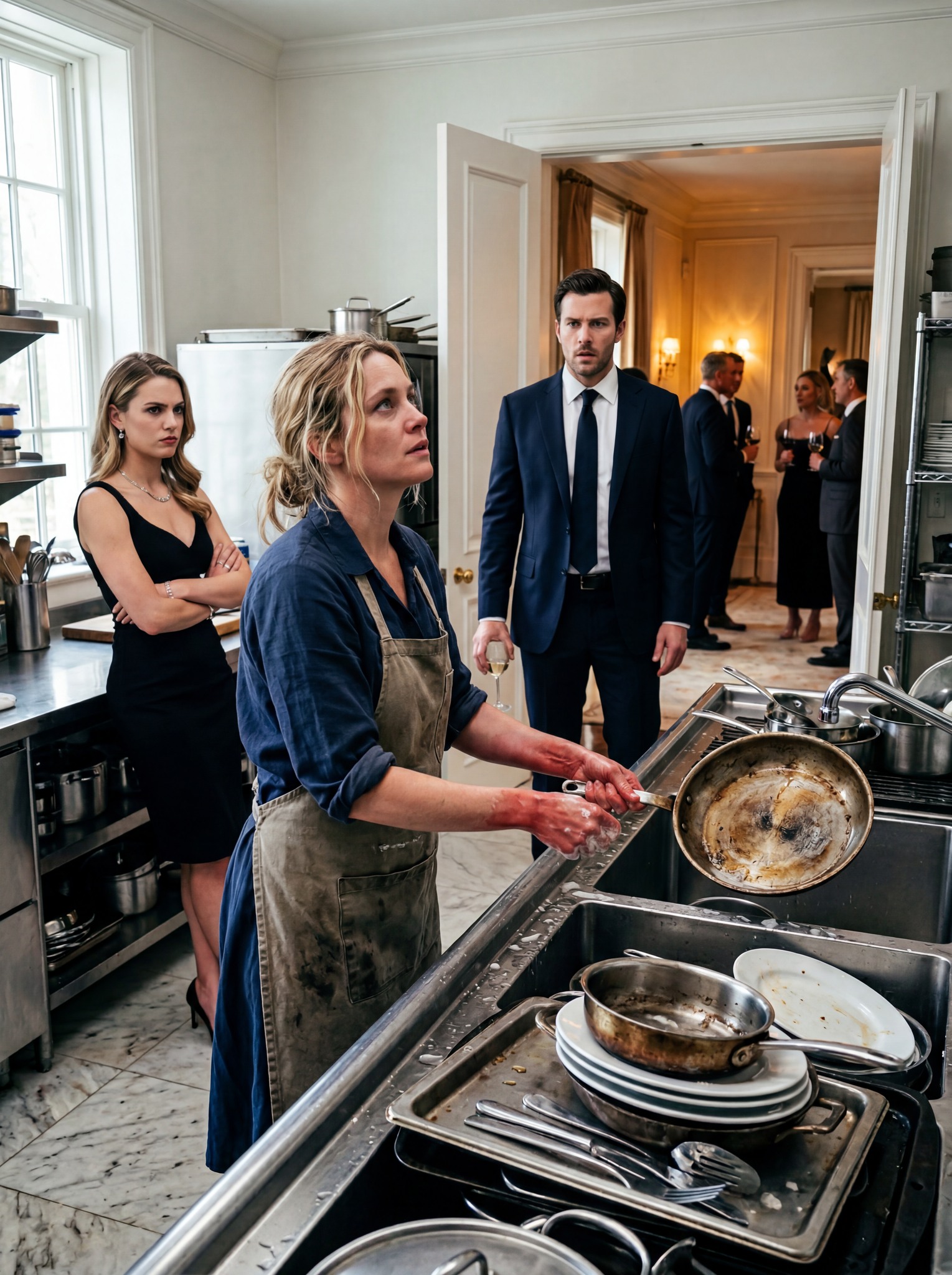 Cuando crucé silenciosamente la estrecha puerta que conducía desde el pasillo a la pequeña cocina de servicio, esperaba encontrar a una criada terminando de fregar los platos después de lo que parecía una reunión en el piso de arriba. En cambio, la imagen que me recibió me dejó tan paralizado que mi mano se quedó congelada en el marco de la puerta.